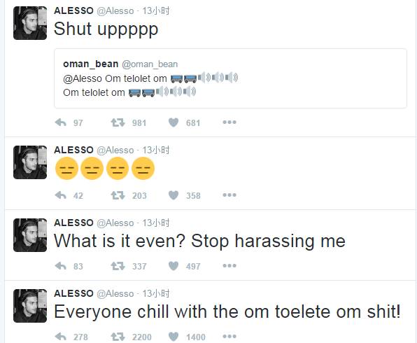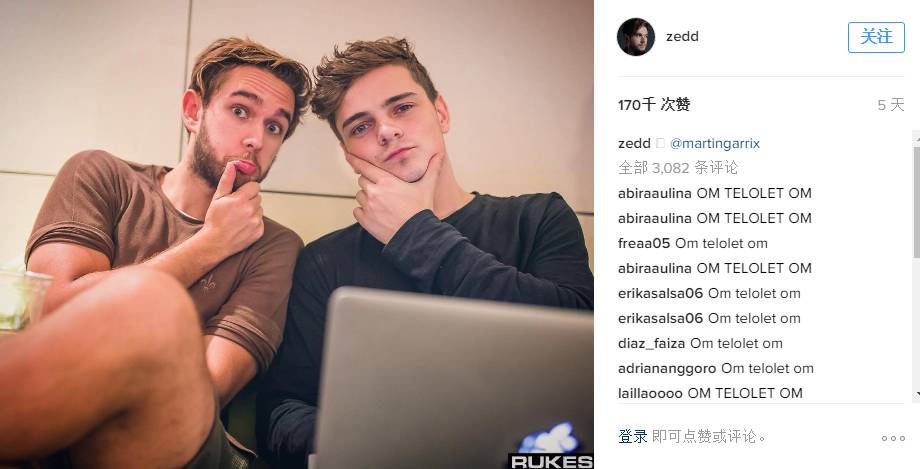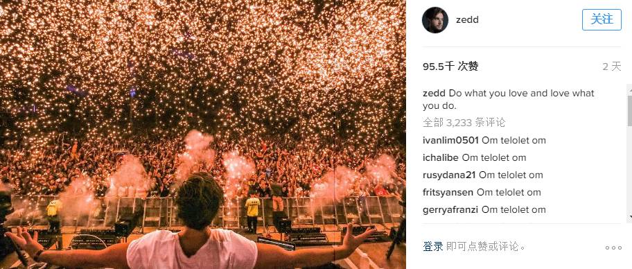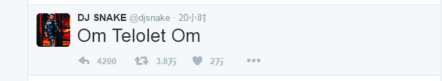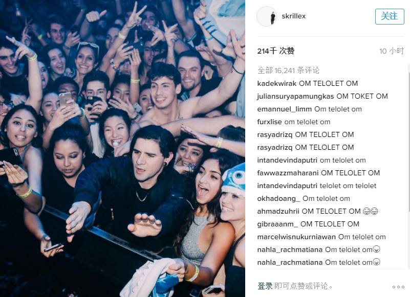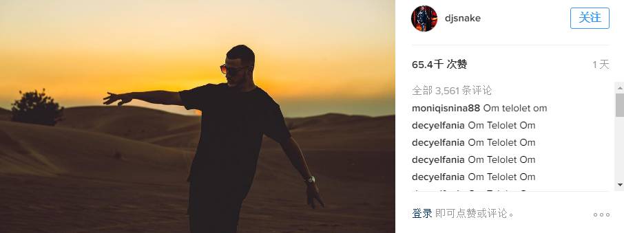 恐怖的转发/评论/点赞数量倒不算什么,但是他正式引领了社交网络全部人都在刷Om Telolet Om的口号,包括其他各路知名音乐制作人&DJ也纷纷跟风,例如Zedd等等,Skrillex等人虽然没有跟风,但评论区一样被刷。需要提醒的是,这次把老梗重刷并不是DJ Snake第一个带的头,但是确实是他把节奏带起来的,也刚好是借着这个最佳时机吧。
