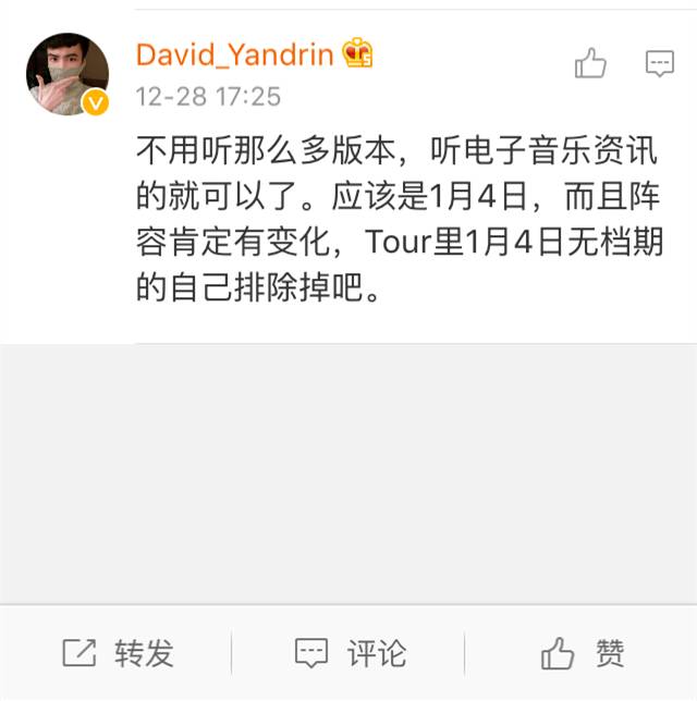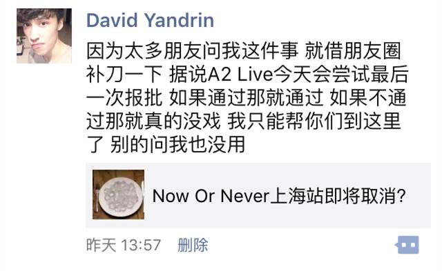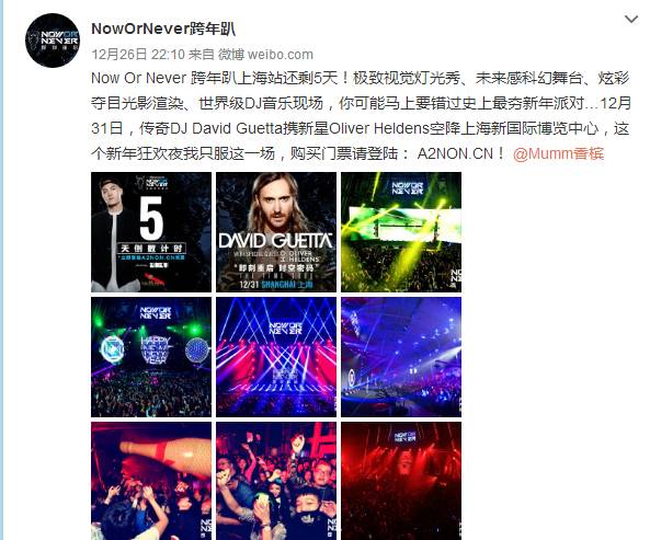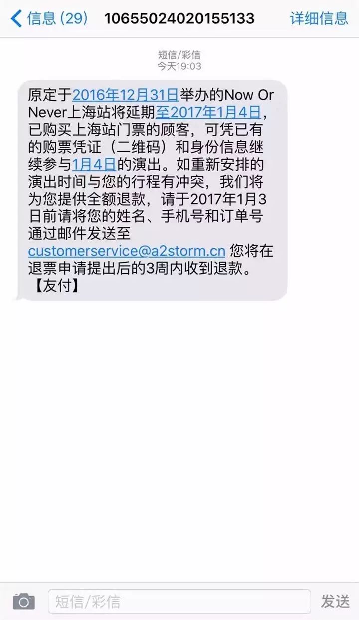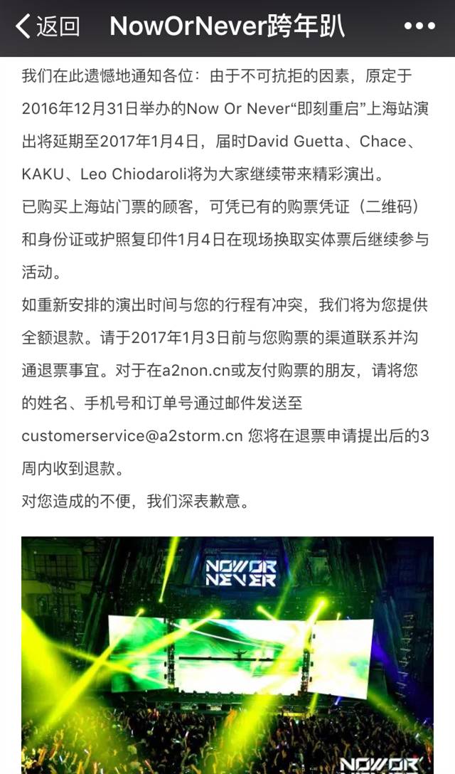 可惜到了今天下午,官方艾特的赞助商却透露已经取消并延期到1月份,随后有电音爱好者通过A2 Live员工了解到延期到1月4日。在官方透露之前我们就已经把这则消息告诉理应得到真相的本来要去Now Or Never跨年的Raver,这个解释是官方欠你们的。