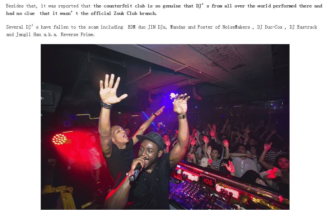 不仅冒充Zouk,而且各方面信息都直接照搬,并对外声称和宣传自己的分店,这就好像一家卖假货的十八流迷你商场的服装店非要把假货当真货卖一样,这肯定是会出事的。这件事之前虽然没有在电音界传开过,但也不能怪我们,就算是冒充也没人敢明目张胆打着对方旗子干长久买卖的,本该一枪一炮走人的事却干长期的不死都不行。