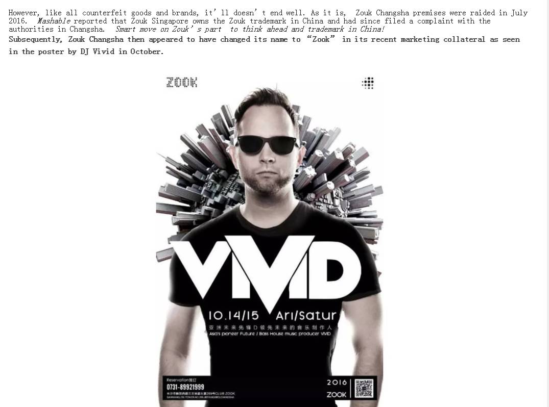 聪明的Zouk在中国也注册了商标,由于跨国纠纷的难题等原因,如果没有这一举止维权将无法成功,正因为新加坡Zouk摆了一道,假Zouk被投诉,遭到长沙当局的处理。至于赔偿了多少我也不知道,但就中国这么多冒充的情况来看估计管得不严,要么也不会这么放纵。有人说光曝光没意思,得走法律才能解决问题,不全对但有道理。假Zouk在此后更名为Zook,多多少少也算把问题解决,不过口碑是彻底毁了。