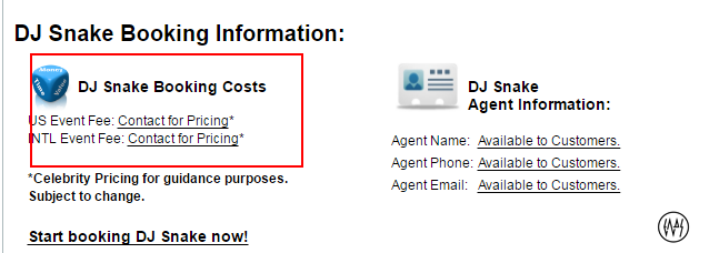 有一些连官网上都没有Booking联系方式的艺人,例如DJ Snake,那你就只好去谷歌搜索了。不过这种情况下往往有非常多Booking Agency,价格经常都很悬殊,有些并不是一手资源,都是从Booking Agency那里拿到艺人然后再抬高价格的,所以建议多对比。