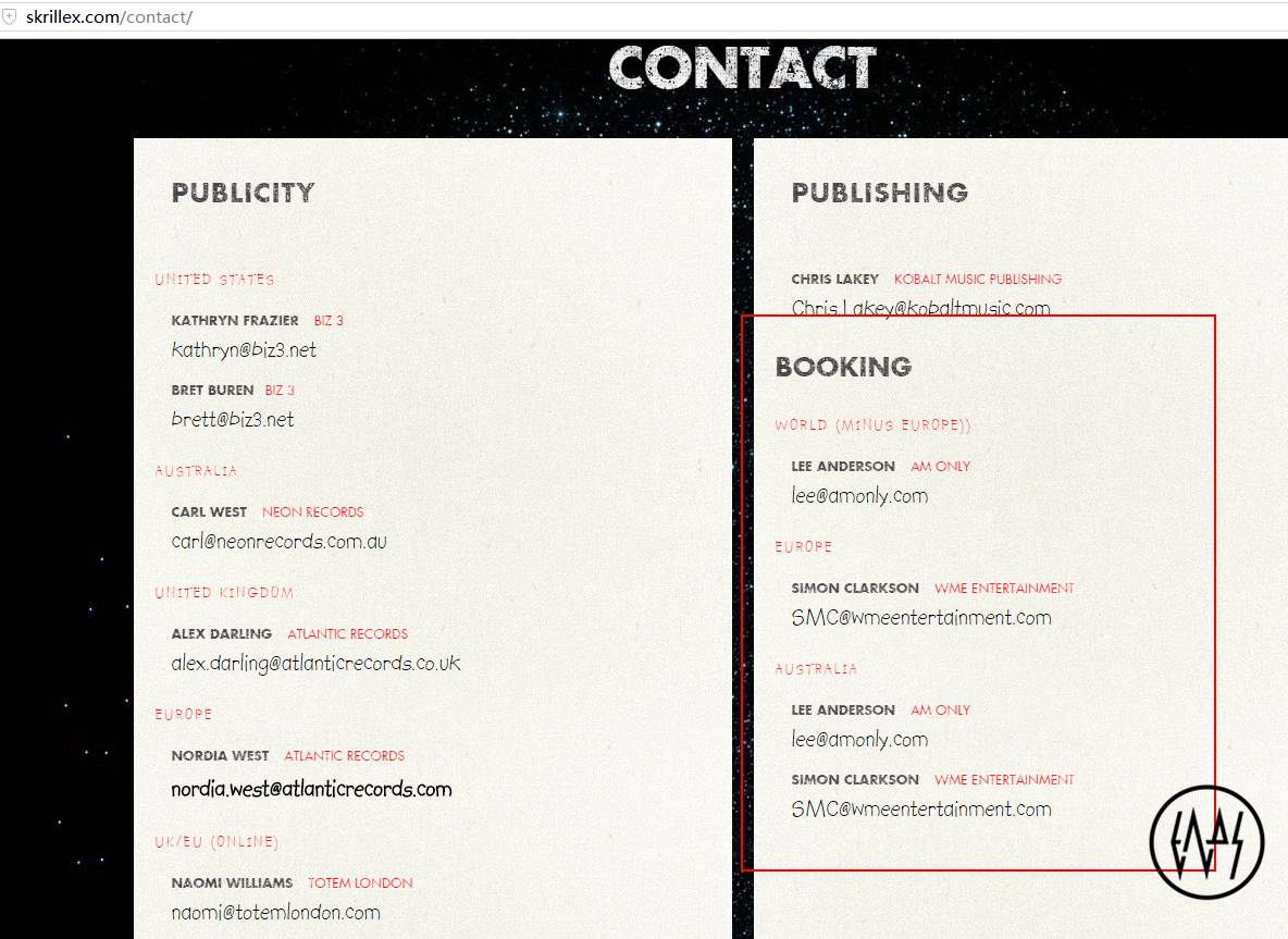 再往上我们可以直接看一些比较大牌的艺人,打个简单的比方,世人皆知的Skrillex,在他的官网上就可以直接看到Booking联系方式。