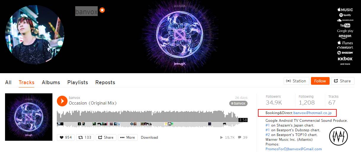 有一些艺人可以直接从Soundcloud上找到他们的Booking联系方式,例如banvox。
