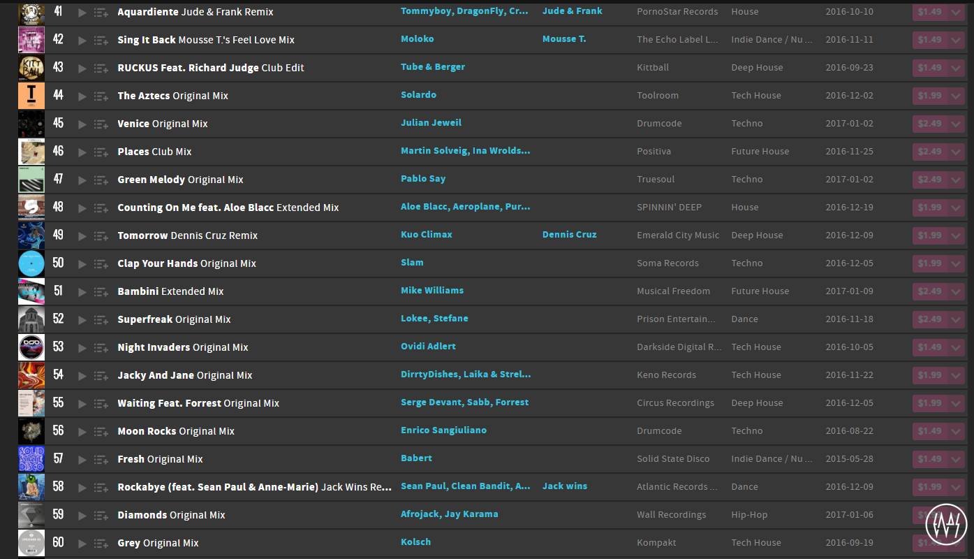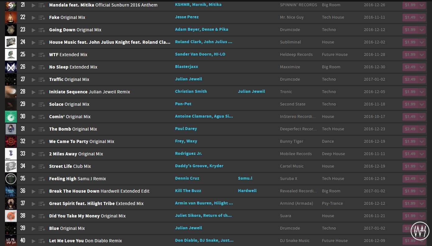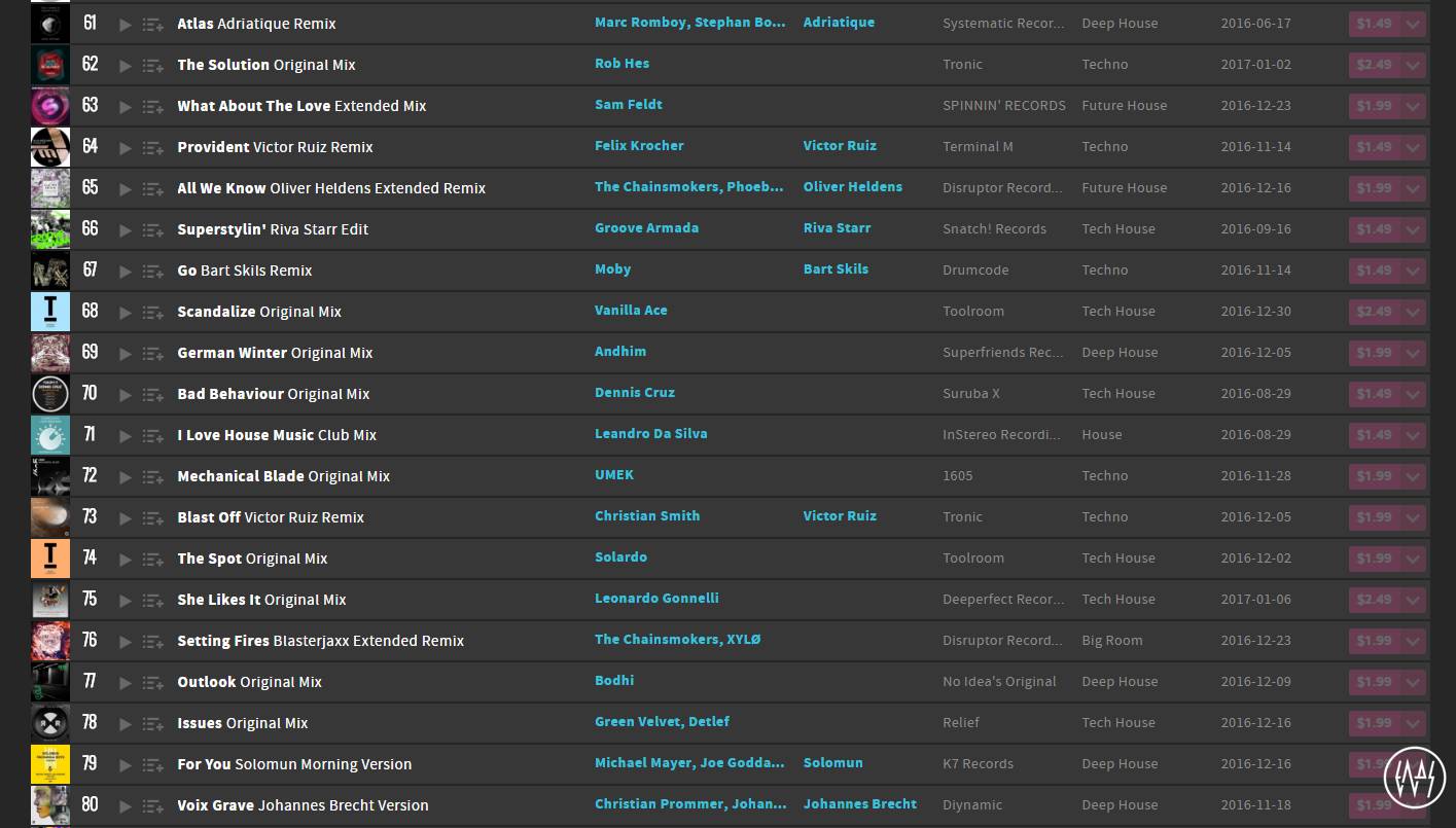 Beatport对音乐的分类一直都不是特别细,很多分支都不会在Beatport出现,在全世界都经常被人嫌弃音乐风格出错,但是仅仅是分类不够精细,归为Techno/Tech House这一举动还是没问题的。可以发现除此之外以Future House/Deep House为主,但许多其实是Bass House。很明显这与之前Bigroom/Progressive House霸榜的情况有着天囊之别,是又一时代趋势。