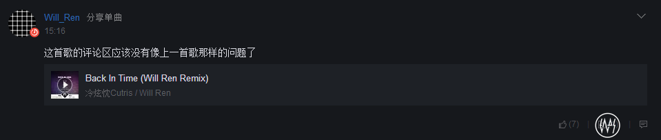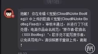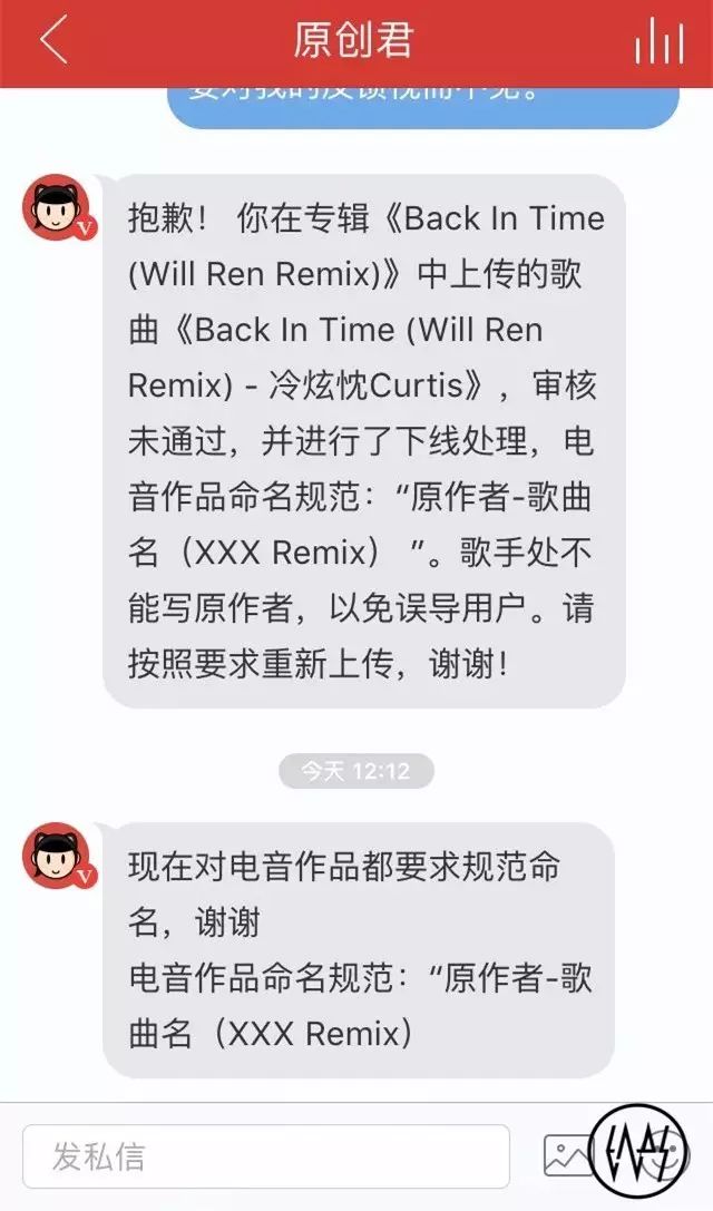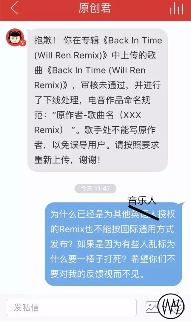 本该是一件很高兴的事,也在短时间内吸引了不少评论,受到挺多人纷纷认可,但后来一则非常不幸的事发生了。Will Ren Remix的《Back In Time》被删除,原因是因为不符合网易云音乐的新格式规矩。事实上,网易云音乐从未公开过出台这则新规矩,大家根本不知道却要受到无辜的处罚,至少评论和转发肯定是跟着没了。按照原创君的意思,新格式与之前截然不同,对歌手/艺人一栏都有新要求。