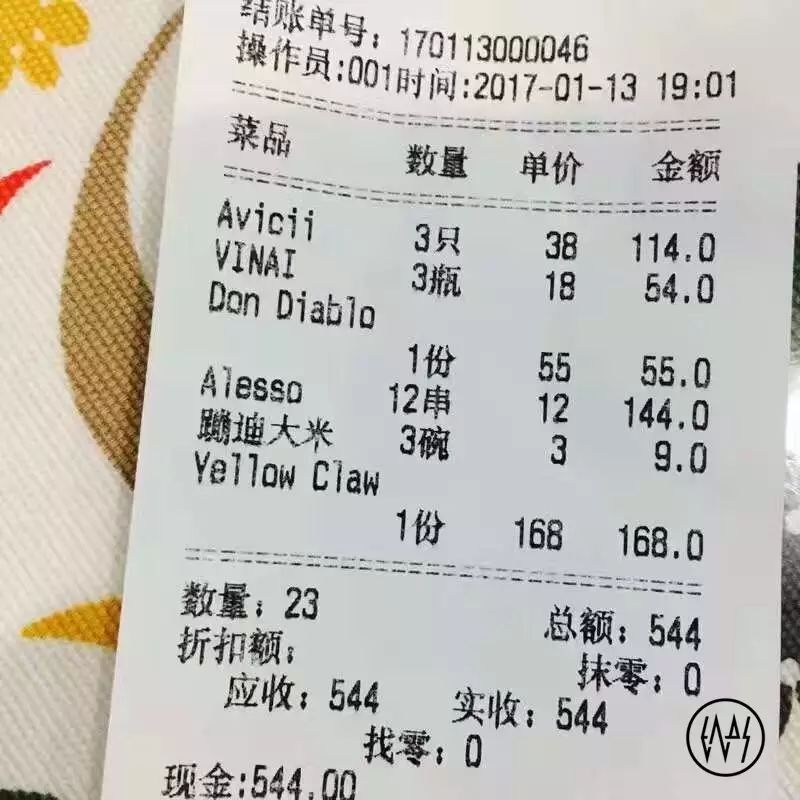 不是每个电音爱好者的梦想都是成为知名音乐制作人&DJ,有些人在自己的其它职业也很成功,喜欢音乐和事业一点也不冲突,没人告诉你要听C-pop才能发财。曾经就有很多电音爱好者被朋友质疑“你又不是做这行的你干嘛研究”,咸鱼是没有兴趣爱好的,不理解很正常。不过你有没有想过,如果电音爱好者开了一家餐厅,那么它的菜单会是怎么样的?看看这张有趣的发票。