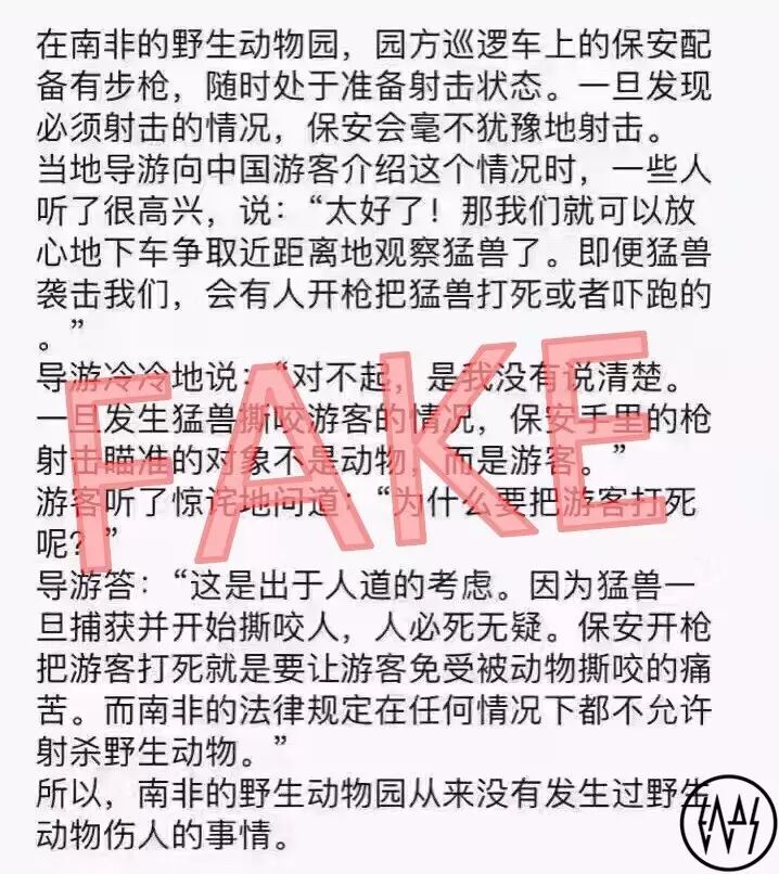 我不需要解释大家也知道发生了什么,这为我省下了很多功夫。讨论量之多,大家对于密密麻麻的文字也已经麻木,所以这篇文章长话短说。首先必须先辟谣,下面这张图片当中的说法完全是假的,各位可以自己去墙外查资料确认,南非根本不存在这样的规矩,恰好反之,南非真正的法律规定是“当动物威胁到人类生命的时候必须立即给予击毙”。目测该谣言起于段子手,他们擅长自制毒鸡汤,误导大众对国外加重错误认知。