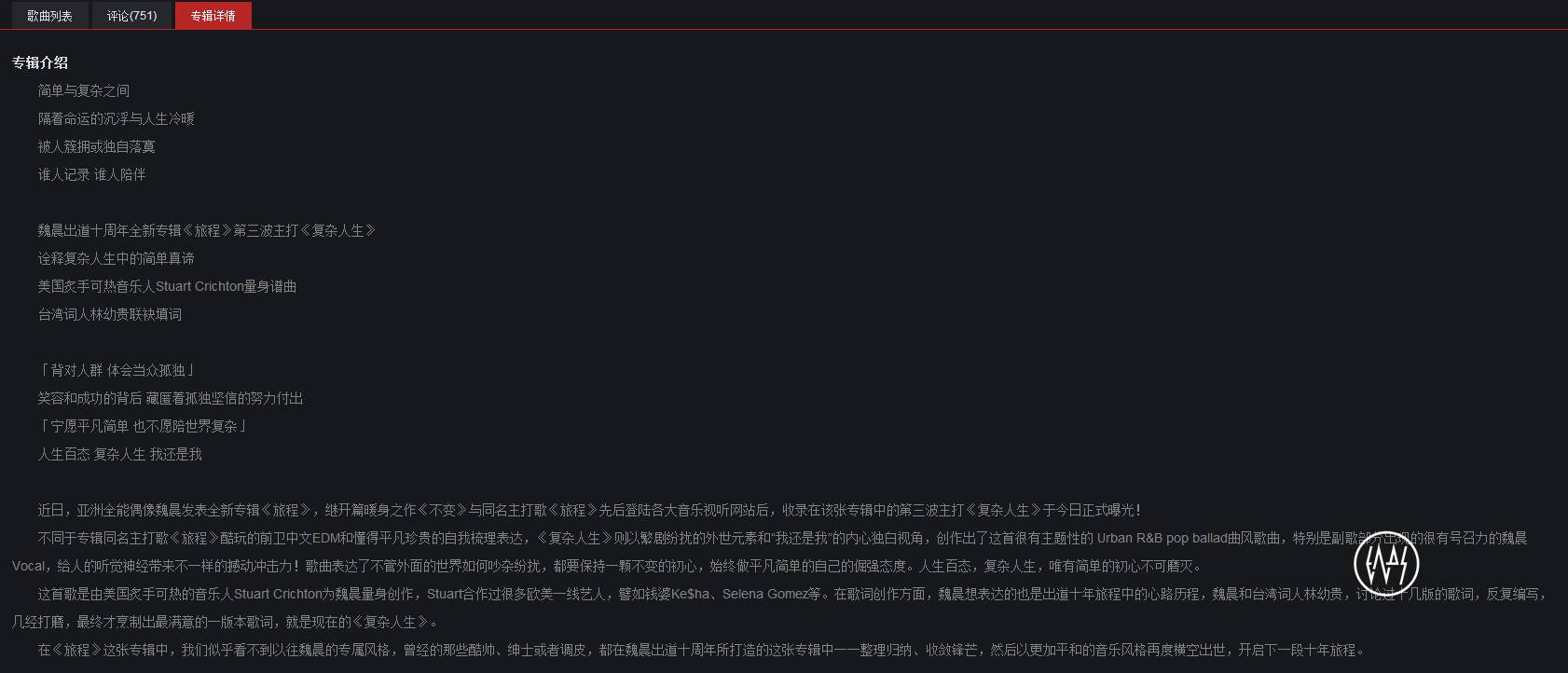 包括在专辑介绍里也完全没有提到“《旅程》是一首翻唱和Remix”,既然你要做翻唱和Remix,既然你要打入电音领域,或者说得更清淡一些既然你要做电音,那就得遵守规矩,这有什么难的?其实这首单曲要是标上Cover和Remix,不仅人气不会比较低,而且还会吸引电音爱好者的支持,获得更好的口碑,影响到粉丝以外的领域,而不像现在搞得两批人马喷了半天。要说理,当然还是电音爱好者有理,要说数量,魏晨粉丝肯定占优势。