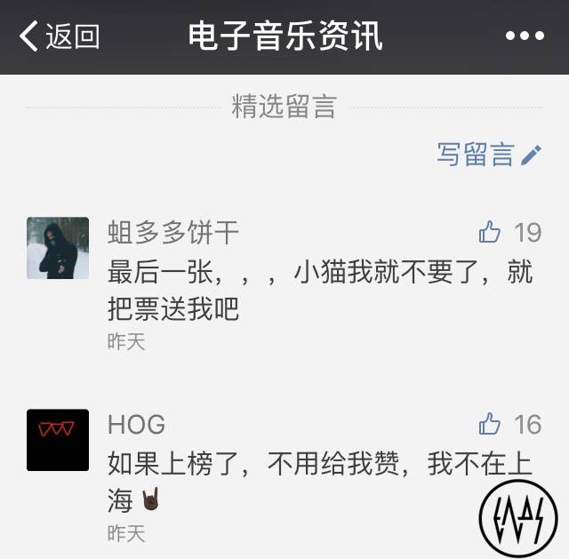 昨天送出两张门票,想知道是谁成为了幸运儿(也许是你过完年的第一场派对)?截止到今天18点,获得赞数最多的这两位朋友分别得到一张门票。来不来是你自己的事,反正我把票给你了,如果你不要那你浪费掉这一百块吧。请获奖的朋友将名字/电话发送至我们公众号后台,凭该信息即可入场。