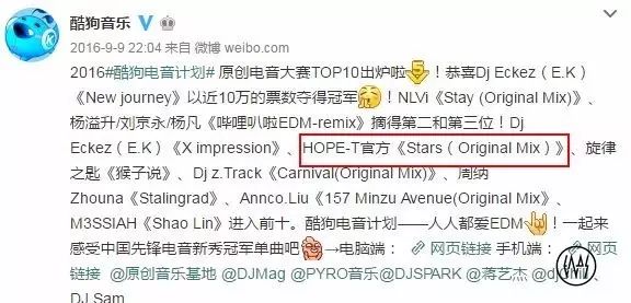 昨晚我看到这张截图之后一点都不震惊,王绎龙只会抄袭不会原创是众人皆知的,听不听电音都知道,王绎龙听Hope-T的音乐是为了从他的音乐里学习“如何盗别人的工程修改旋律”,完全可以理解,都那德行。就在今天又有公众号粉丝发来一张截图,更是让我们笑掉大牙。这首盗工程的单曲竟然是酷狗音乐“原创电音大赛”前十名?难怪,什么档次的音乐软件评选出什么档次的音乐,烦请酷狗先分清楚电音和DJ的正确意思再试图进圈吧。