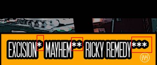 我们不小心忽略了这一点,这的确是我们的疏忽,希望借此填补还来得及。那么Excision/Ricky Remedy/Mayhem会在哪些地方出现?在这些演出信息当中,场地后面带有*的代表Excision会出现;场地后面带有**的代表Mayhem会出现;场地后面带有***的代表Ricky Remedy会出现。注意,这样的标示不太清晰,所以理解错误的人非常多,不光只有国内电音爱好者,西方也有很多人误以为他们将出现在每一站。