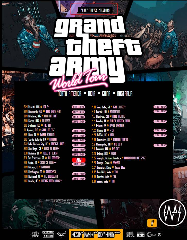 Party Thieves是世界知名音乐制作人&DJ,他的主要音乐风格为Trap/Heaven Trap/Trapstep/Future Bass等,这次巡演的主角是Party Thieves,海报上的所有站都是已经成功Booking Party Thieves的全球各地夜店/仓库派对/音乐节。Excision/Ricky Remedy/Mayhem在这次的演出信息上实际是类似于Support DJ的身份,Excision/Ricky Remedy/Mayhem只会在部分站演出。