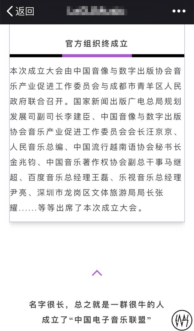 前两天因为这件事,中国电音界也算又热闹了一把,但因为发出这件事的公众号本身粉丝数并不算非常多,所以阅读量低于预算值。大概描述一下发生了什么。前两天一个活动主办方公众号公布了一则消息,大概的意思是“一堆正腐人员成立了一个电子音乐联盟”,这应该是最简单的概括,也是最清晰易懂的,如果你还是不明白,那你可以理解为“这群人要开始参与电子音乐行业了”。哦对了,他们还把自己标榜为“原年”。