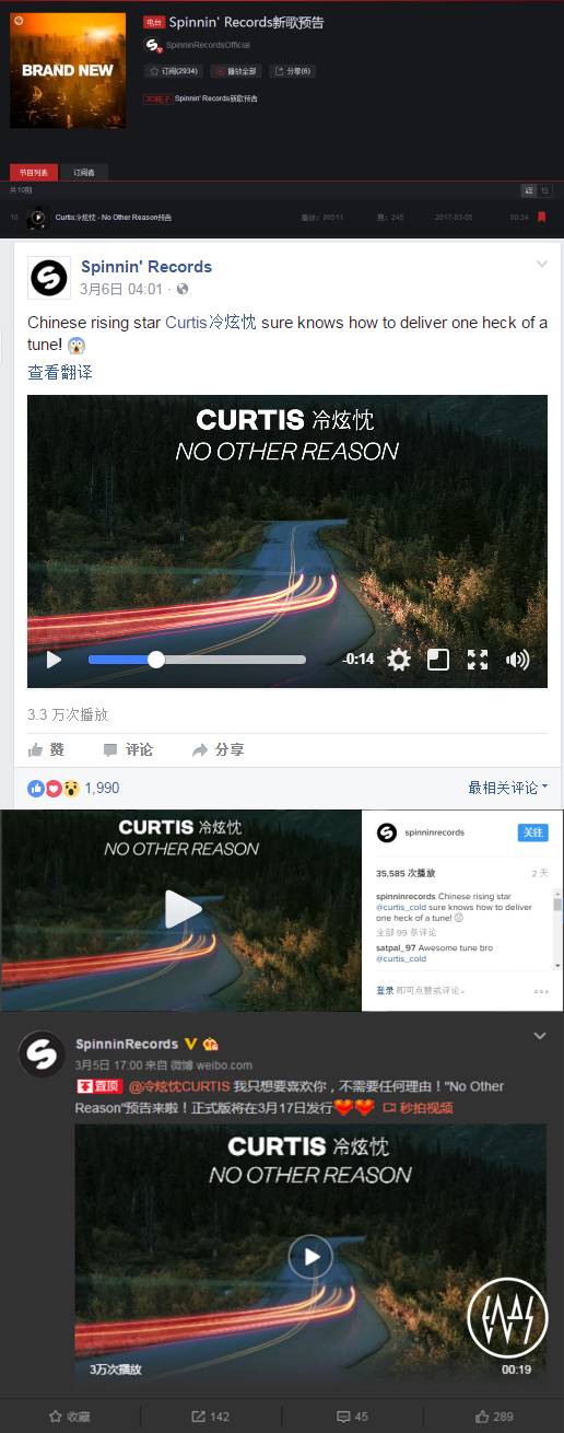 先说好事。Curtis新单曲《No Other Reason》预告,仅仅两天多的时间在网易云音乐获得9.7万播放量/Facebook获得3.3万播放量/Instagram获得3.6万播放量/微博获得3万播放量,总数高达20多万,并远远突破Spinnin'网易云音乐电台记录。完整版会在3月17日正式发行,一起见证国产电子音乐崛起,我相信再过几年,中国电子音乐圈子里这些家喻户晓的艺人将不再仅限于几万粉丝,达到几十万乃至几百万并非不可能。