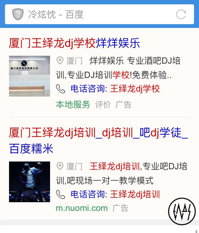 什么坏事?如果你无意中在百度上搜索“冷炫忱”,很有可能会被某个结果所触目惊心。所谓的“王绎龙DJ培训”竟然用起“冷炫忱"当竞价关键词,可能大家不了解百度推广,但总记得莆田系医院的那些事儿吧?他们只需要向百度支付费用便可以轻而易举地掌控排名,右下角会出现“广告”字样。由于百度竞价可以设置手机端口和推广城市,哪些城市投放/哪些城市不投放,所以部分城市可能不会搜索到这样的结果。