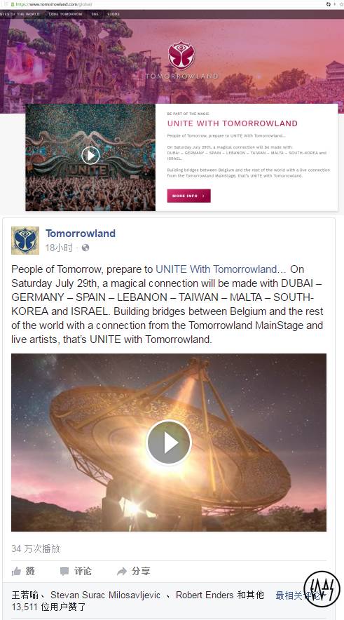 前几天Ultra正式公布将在今年登陆中国上海,引起全国电音爱好者的强烈反响。时到今日,如果你聊起Ultra,它仍然会是最热门的话题,将吸引更多人的注意。当然,Ultra很棒,要来中国了这一点毋庸置疑是好事,对于整个电音文化发展都是一种推动,就算还有一些未知的因素,但无论如何它终究利大于弊。就在昨天晚上,Tomorrowland旗下项目UNITE With Tomorrowland宣布将会有中国台湾站,以及一些其它国家。