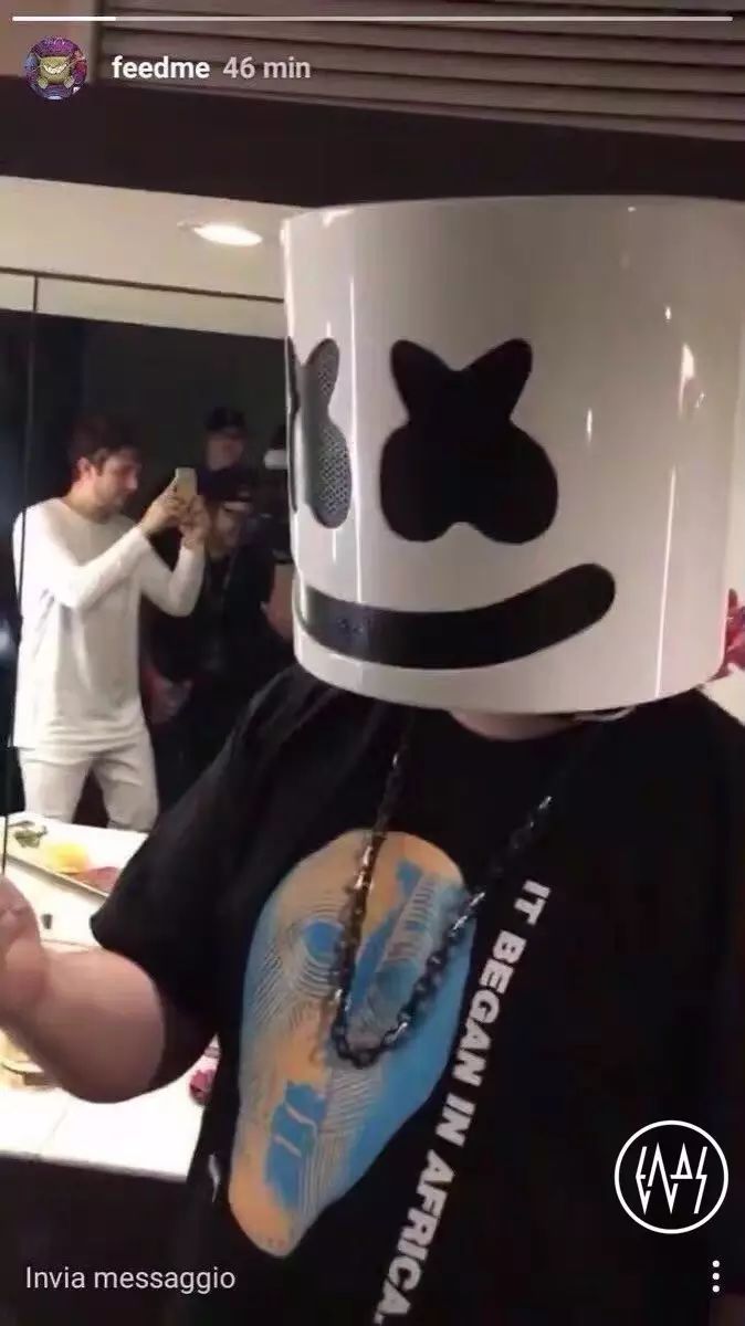 还有一个非常重要的就是身材问题,Marshmello越来越胖了,毋庸置疑。Marshmello就是Dotcom,这已经有非常完整的证据,有趣的是你现在去看看Dotcom的照片一样会发现他的肚子也越来越大了。前段时间在Feed Me的直播当中,Marshmello被镜子出卖了,没有戴帽子的他被直播拍到,这不是第一次证明,可至少算得上又一次论证。Dotcom会换发型/换发色/留胡子,但身材是不可能一瞬间转变的。