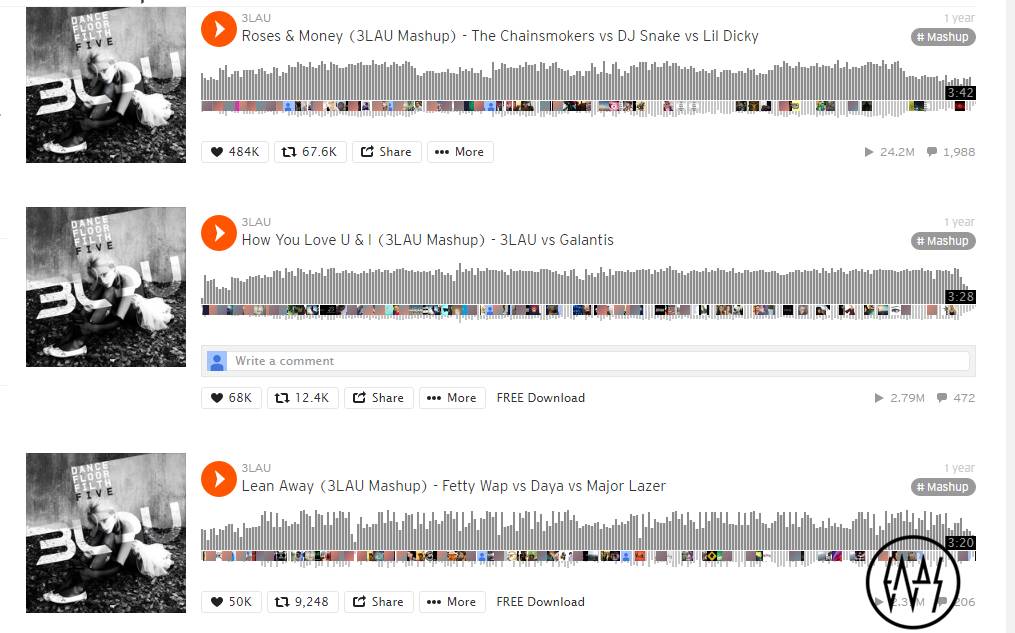 除了使用以上罗列的几种符号将几首歌的歌名加在一起以外,还有一种方式,就是把歌名也做个“Mashup”。这次我们用Mashup首席代表3Lau做例子,将《How You Love Me》和《U & I》做个Mashup就成了《How You Love U & I (3LAU Mashup)》,将《Lean On》和《Hide Away》和《679》做个Mashup就成了《Lean Away (3LAU Mashup)》,以此类推。当然他做过很多非常优秀的Mashup,都可以参考。