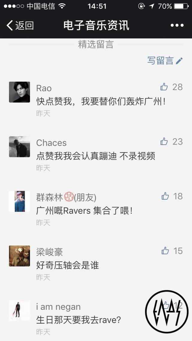 昨天我们又为大家带来一次赠票福利,没有参与的你很有可能会后悔,还有好几位未公布的艺人,这可不是一般在夜店的个人演出。那么现在结果将公布,截止到今天14:51,获得赞数最多的五位粉丝分别获得一张门票,结果如下图所示。请这五位粉丝尽快将名字/电话发送至我们公众号后台,到时候即可凭该信息入场,也记得继续关注其他未公布嘉宾,这份惊喜只带给有准备的人。