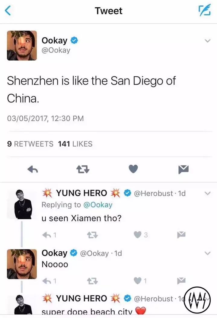 中国令一些来自西方的国际巨星留下了好印象,你可别让自己脱节还不知道,只要关注了最酷的公众号。对于听电子音乐的人来说,Ookay和Herobust绝非陌生的名字,可能对于不听电子音乐的人来说,也会对这两个名字有所耳闻,听到他人讨论。Ookay认为深圳相当于中国的圣地亚哥,Herobust暗指厦门同样值得一去,并将厦门称之为超级酷的海滩城市。当然两位对于两座城市都给出了极高的认可,也说得十分在理,手动比心。