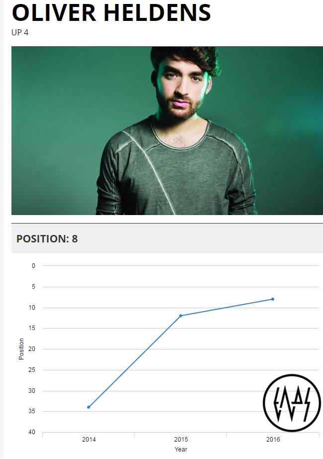 2017年,Oliver Heldens更上一层楼,在DJ Mag百大DJ排行榜中拿下第八名。相信对于DJ Mag百大DJ排行榜的粉丝来说,深入了解电子音乐文化或者什么音乐风格甚至去好好认识一个人可能都比较复杂,但榜单却能说服他们应该去喜欢谁,因为DJ Mag百大DJ排行榜而喜欢Oliver Heldens的人不在少数,这是一种非常入门且普及的渠道。我们不管你是喜欢他的音乐,排名,亦或者其它,这是你的入口,我们无权左右。
