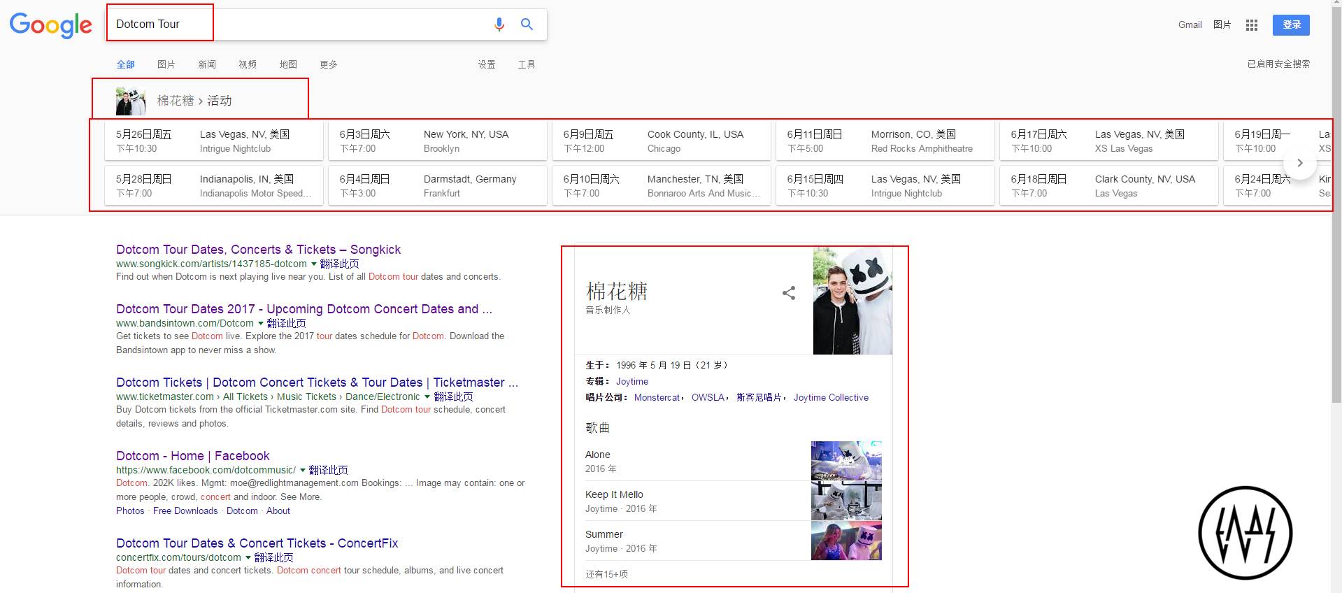 之前有西方媒体称“声音不一样”,其实你戴个头套说话,声音也会不一样。再说,对于既看过Dotcom现场又看过Marshmello现场的人来说,应该都知道这只是西方媒体随口一说,事实上声音并没有很大的区别。昨天我们在谷歌上搜索Dotcom巡演的时候,惊讶地发现几件事,当然最关键的一件事就是,连谷歌都直接把Dotcom和Marshmello的资料同步化了,作为全球最大的搜索引擎,相信你明白这意味着什么。