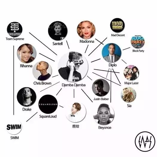 Rihanna/Santell/Chris Brown/Drake/Madonna/Justin Bieber/Beyonce/Sia/Major Lazer/Diplo/鹿晗/Block Party/Britney Spears/Kehlani/Elijah Blake等,如果这些名字你一个都没听说过,那你回家吧。Djemba Djemba长期与顶级歌手或音乐制作人有着合作,充当着幕后音乐制作人的身份。同时Djemba Djemba还是非常多知名音乐制作人/DJ背后的枪手音乐制作人,可谓称得上是你看不见名字的时候就早已征服大众的超级制作人。
