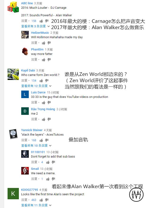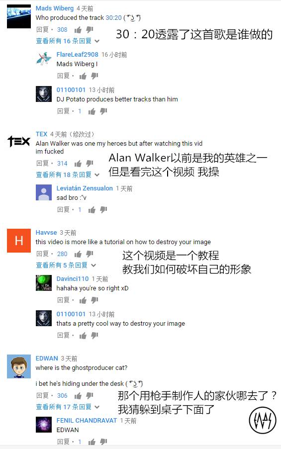 目前这个视频在Youtube上简直热火朝天,已经出现大量恶搞视频。没有人用脏话侮辱Alan Walker,大家只是把这个视频挂出来,顶多加些自己的看法,但不知道为什么看起来特别讽刺。