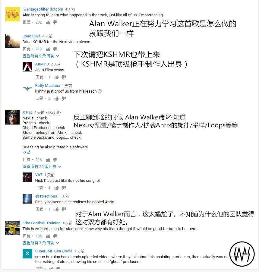 如果这还不足以证明什么,那么我们非常建议你看完整个采访视频。在整个采访的过程中,Alan Wlaker无法解释任何音乐制作的过程,这其中整首单曲的制作都是由Mood Melodies来说明的。从创意到音色调制再到整个DAW操作,我们很明显地发现了一个有趣的现象,Alan Walker是个路人,Mood Melodies却对《Alone》的完整制作一清二楚并且滚瓜烂熟,全程描述。Alan Walker的粉丝别着急喷,先看完整个视频再说。