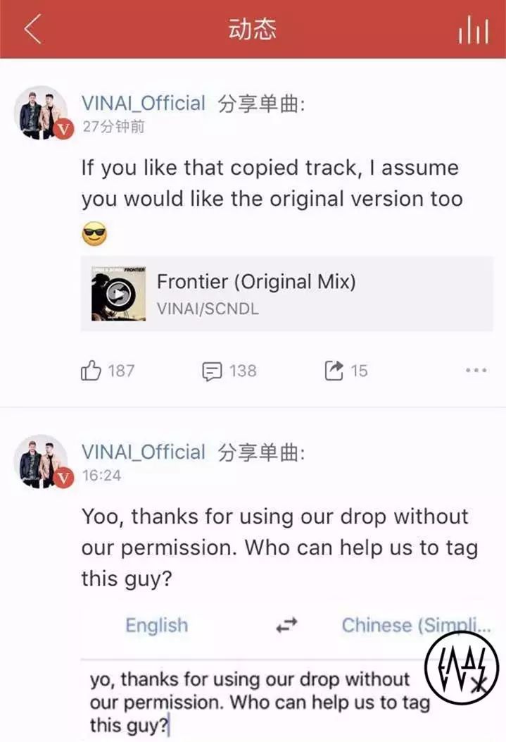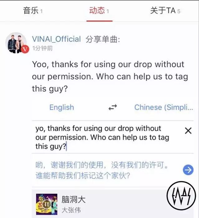 Vinai在网易云音乐上发布了动态,明确地发表了观点,认为大张伟“未经许可使用了他们的Drop”,说白了就是照搬。