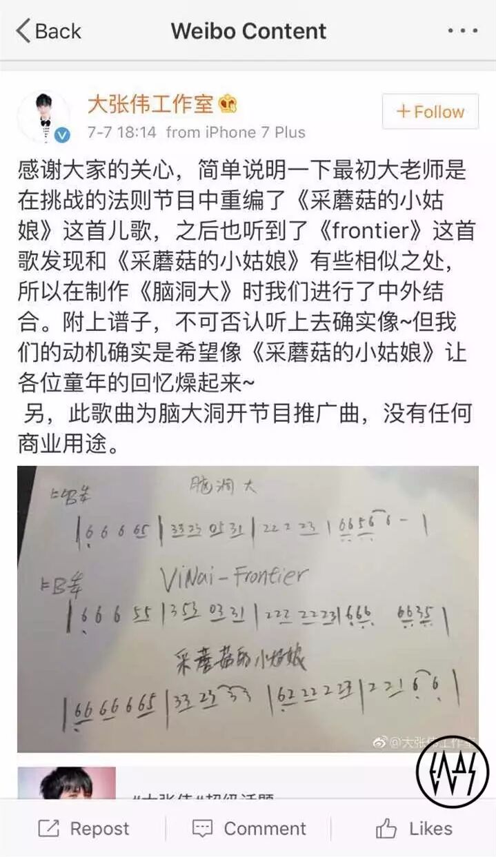 大张伟团队的洗白方式不仅没有救赎大张伟,反而让大张伟招了更多黑。大概的意思是抄袭了《采蘑菇的小姑娘》和《Frontier》,而抄袭《采蘑菇的小姑娘》是为了“引起童年的回忆”,更偏向抄袭《采蘑菇的小姑娘》而不是《Frontier》。甚至觉得“推广曲不属于商业用途”,“非商业用途可以抄袭”,整段洗白突出了流氓态度,大概的意思是“你说错了,我不光抄袭了你,我还抄袭了别人,而且我乐意,这叫中西结合”。