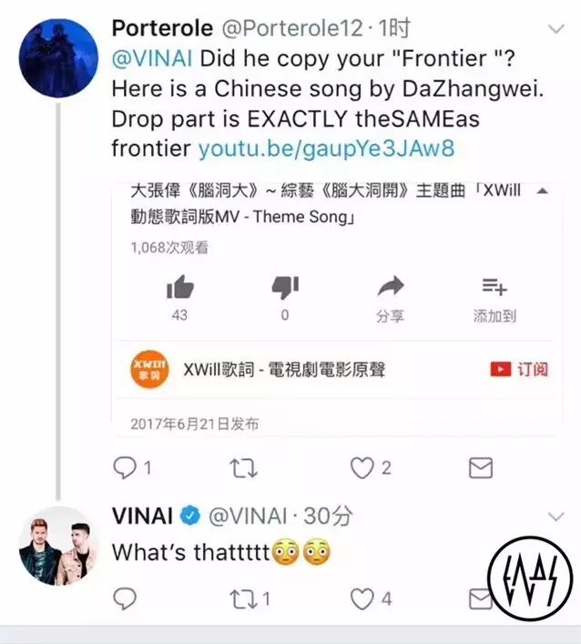 很多人都在关心之前大张伟抄袭Zedd的事到底怎么样了,我们听说大张伟付了一笔费用,算是给这件事做了个收尾,说得好听点就是买下了《Candyman》的编曲和乐器旋律的使用权。随着被Zedd抓现行之外,这次被Vinai抓到也不是什么小事,大张伟的粉丝还是一贯地将被抄袭的艺人称之为“18线小DJ”,这样的粉丝真的可以算是一粉抵百黑了,一句话不知道得罪多少人。至于文后如何发展,陆续关注Vinai和我们的动态。