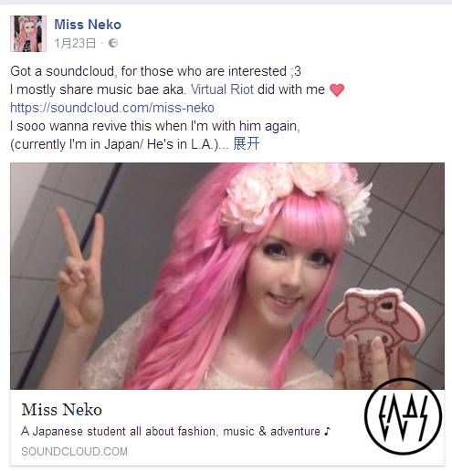 有一个非常有趣的特点,Miss Neko的大部分社交网络动态都在表达自己对日本文化的热爱,而且这样的热爱持续了非常多年。可能对于很多人而言,很难想象一位德国姑娘能对日本疯狂痴迷到如此程度,在Miss Neko看来,日本的一切都是美好的!Miss Neko在日本过的生活,做的任何事,都能让自己非常快乐,毫无保留地传递着对日本的热爱和对Virtual Riot的情感。
