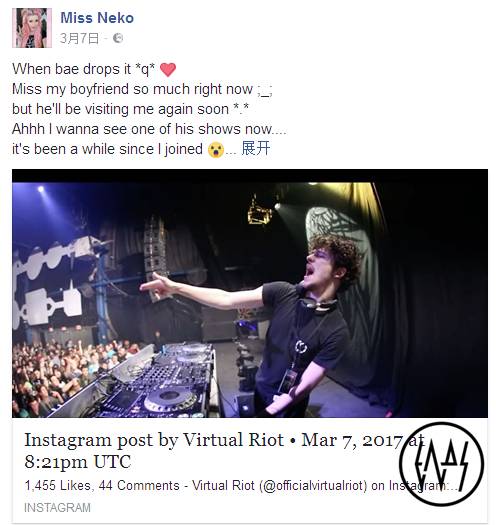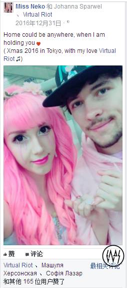 明星总是很少秀恩爱,一点是不想让一堆女粉丝脱粉,一点是保持自己艺人的身份,Virtual Riot也不例外。虽然Virtual Riot自己很少秀恩爱,不过,可不代表Virtual Riot的女朋友不来这一套。Virtual Riot的女朋友不仅是个炫夫狂魔,还是一个日系德国姑娘,甚至是有点儿名气的小网红。如果不是因为长着一张白人的脸,人们很有可能会以为Miss Neko是个日本人。要说起为什么人们会知道Miss Neko,还是要追溯到2015年。