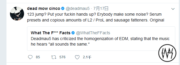 deadmau5很早的时候说过,“EDM只是电子音乐里面很烂的子风格”。不是所有Dance音乐都可以算是EDM,也不是所有电子音乐都可以算是EDM,EDM也不是字面上“电子音乐+舞曲”这么轻松就能破解的题目。deadmau5进一步向乐迷们证明什么是EDM,7月17日,这条推特动态可真的是值得鉴定的。除了前几句不需要解释以外,Serum预置大部分是EDM音色,确实经常被EDM用到,其余提到的是频繁用于EDM的DAW插件。