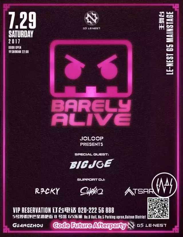 Barely Alive中国巡演广州站,即本次Code Future的Afterparty。Barely Alive的演出时间与Virtual Riot在Code Future的演出时间没有任何冲突。Virtual Riot在24点结束演出,而Barely Alive在凌晨一点半开始演出,最好的计划当然是在确保自己已经买了Code Future门票又取得了Afterparty赠票的同时,将两位Bass大将尽收眼底。Code Future的预售票只剩下不足10%,欲购从速,预售票售罄后将会开放普通票。