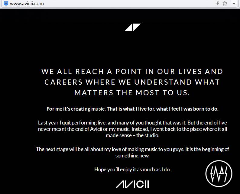 就在去年,Avicii正式宣布退出舞台,也就是不再演出,原因是自身身体情况不容乐观,无法再继续每年200多场乃至300多场的全球巡演。但Avicii明确说明不会停止音乐制作,而且会在退出舞台之后会回到工作室继续音乐制作,并在接下来为乐迷们带来一张新的专辑,而这张专辑整整从去年预告到今年。严格来说,新专辑的发行并不能代表着Avicii会回归舞台,这两者并不能直接划等号,官方也做出了声明。