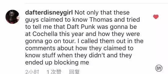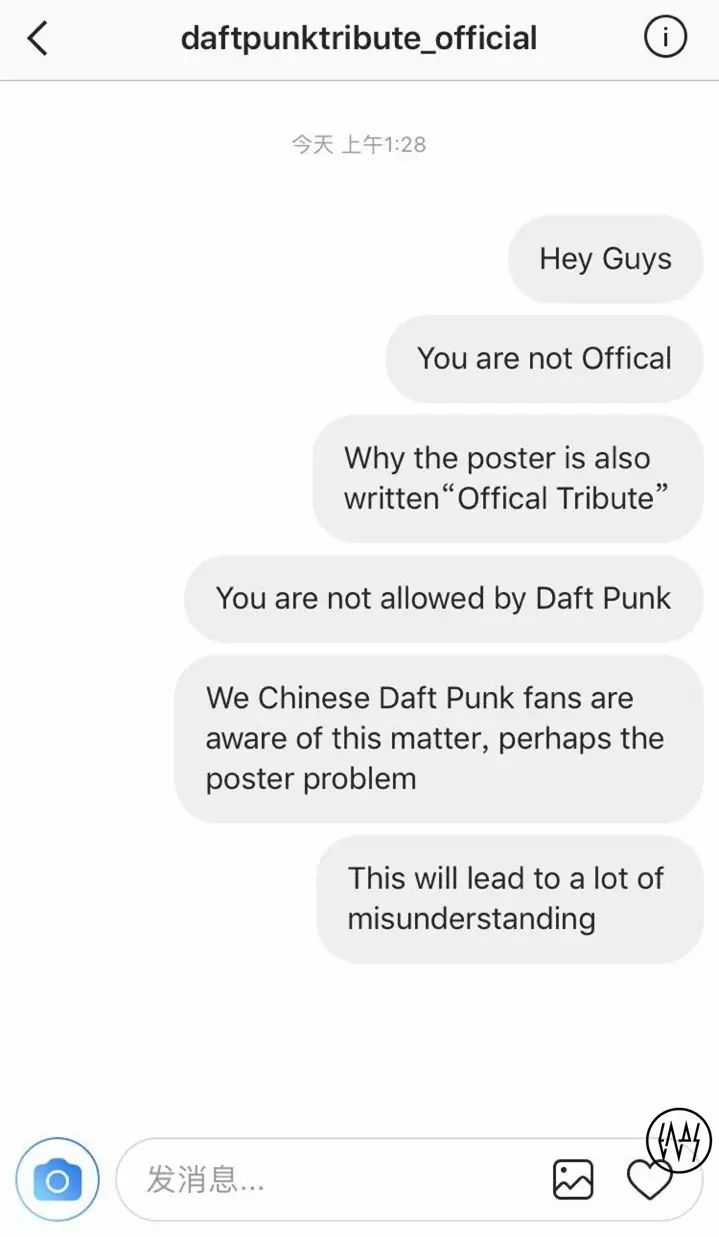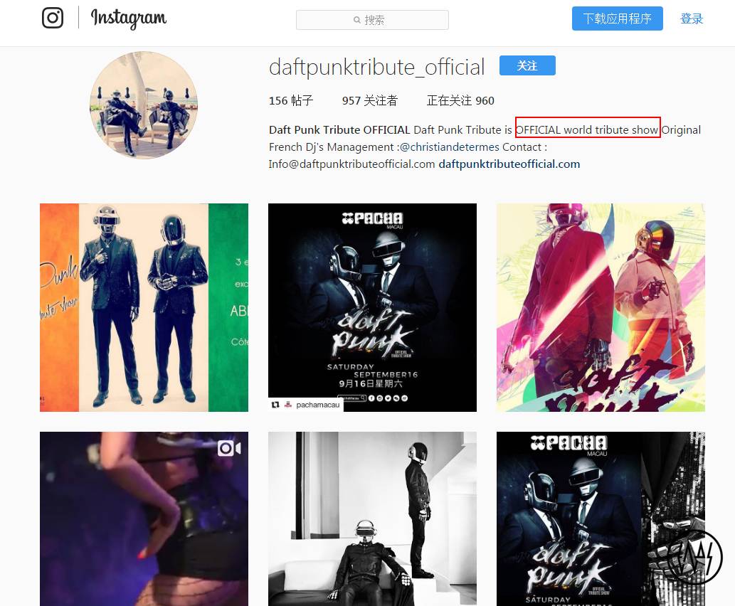 本身冒充Daft Punk演出,消费Daft Punk,拿Daft Punk的形象去赚钱,已经是不要脸到极致的事了,更何况自称“官方”这真的太严重。而且细心的朋友会发现,这个组合玩的一种文字游戏,在Instagram的名字是“Daft Punk致敬官方”,但是在各大海报和宣传/Press Kit上就成了“官方致敬”。很明显这不是一个意思,但是在使用同两个词的前提下偷换概念,是对Daft Punk的严重侵权。