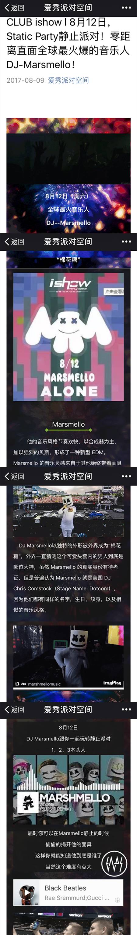 冒充人又冒充产品,Marshmello真的太惨了,就被这么疯狂消费?Marshmello多次在中国被冒充,打着Marshmello名号圈钱骗门票/骗酒水钱的事件从未消停,也不需要再过多解释什么。冒充Marshmello的现象仍未终止,从夜店到仓库派对甚至连音乐节都有出现,前段时间又出现了一起。这次的夜店,甚至还把Marshmello的名字打错了。