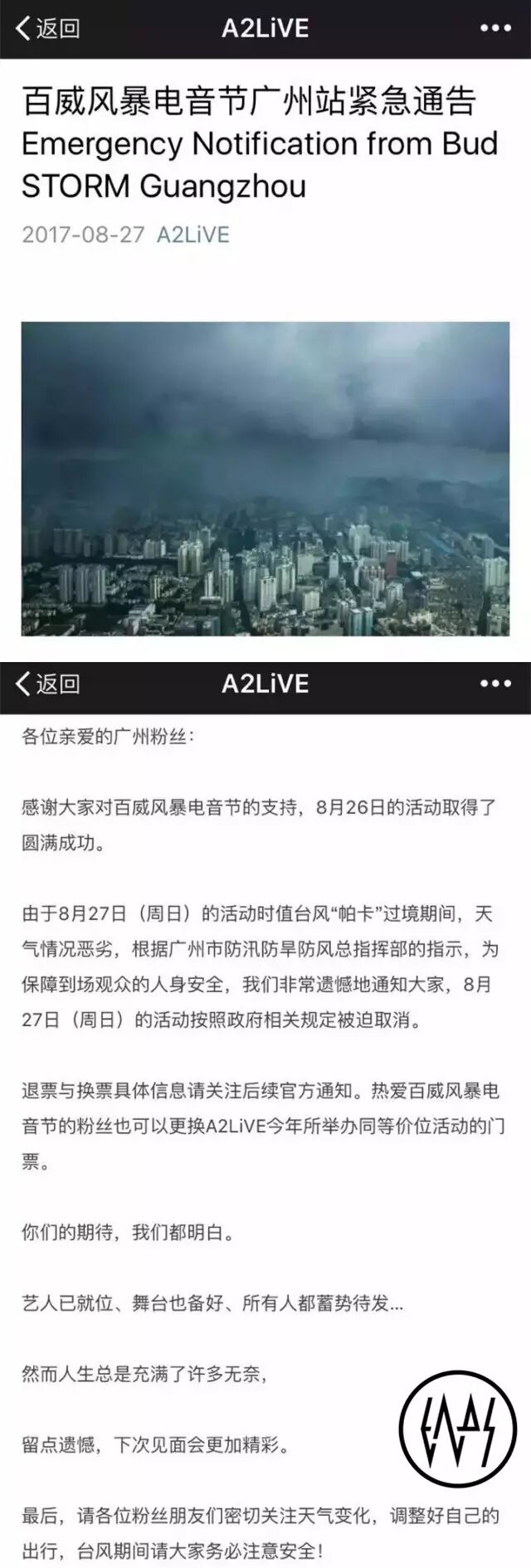 但是,就在昨天结束后的不久,电音爱好者开始疯传,“因为台风帕卡袭来,风暴电音节第二日将被迫取消”。有很多人开始了剧烈地争议,这成为了朋友圈和不少群聊的大新闻,到底是真的取消还是谣言,人们很难得出一个统一的结论。没过多久,主办方就正式宣布因为超强台风帕卡的登陆,风暴电音节广州站第二天取消的事实。传言被官方证实。