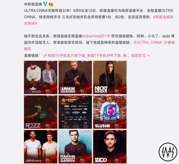 与此同时,有趣的是,同属王思聪旗下的另一个项目熊猫直播将作为本次Ultra China的独家直播平台。官方音乐节,官方直播,这够酷吧?许多人都在哭诉,Ultra China的门票已经全数售罄,还没买呢,这太惨了,但是没关系,还可以选择在熊猫直播上看直播!