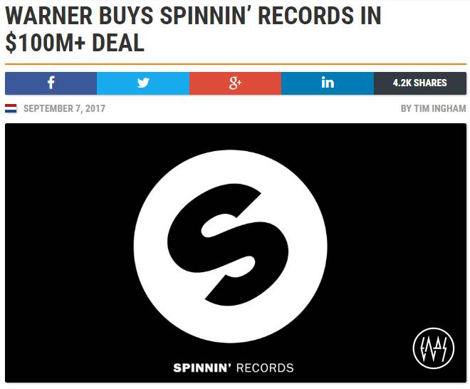 就在昨天,全球知名网站Music Business Worldwide宣布,华纳耗资一亿美金,正式收购拥有数千万粉丝的全球最大电子音乐厂牌Spinnin' Records。在此之前,Spinnin' Records同时还是全球最大的独立厂牌,没有之一。