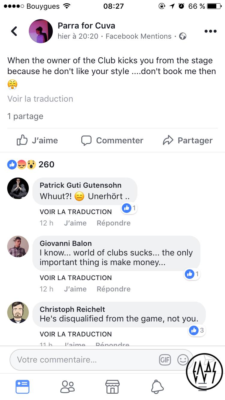 来自德国柏林的音乐制作人/DJ——Parra for Cuva,当下遇到了这样尴尬的事。Parra for Cuva也不会是个服软或者忍气吞声的人,很快就在Facebook上直言:“当夜店的老板赶你下台,因为他不喜欢你的音乐风格……这种人别来请我演出”。