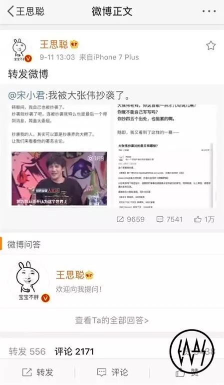 知名电音爱好者王思聪在刚刚忙完Ultra China之后,也参与进来了!众所皆知,大张伟的最新抄袭杰作不光在作曲和编曲方面抄袭,连作词都要抄。被抄袭作词的是作者宋小君,而有趣的是王思聪在今天13:03转发了宋小君这条揭露大张伟抄袭的博文。