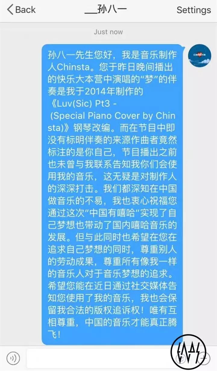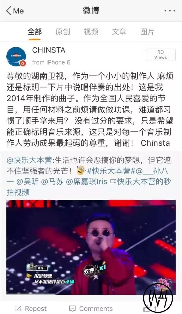 中国音乐制作人CHINSTA在9月3日,于微博上指出中国说唱歌手孙八一在湖南卫视《快乐大本营》演唱盗伴奏单曲。虽说至今已经有十天之久,但可能因为CHINSTA知名度不足等原因,孙八一盗伴奏的不争事实却没有得到任何应有的回应和解决。