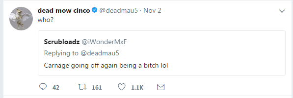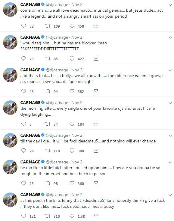 在Carnage把视频发布到社交网络之后,结局是必然的。Carnage被Deadmau5的粉丝一顿“吊打”,大批人马杀到Carnage的社交网络,一人一口唾沫星子都能淹死Carnage。Carnage不仅忙着删除评论,还在推特上发了疯似的继续谩骂Deadmau5。