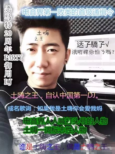 土嗨音乐:我们平时听到乡村摩托、两元店、清仓店、乡巴佬服装店、城乡结合部游乐园、杀马特溜冰场等那些播放你确定它是电音,但是一听就是国人制造的,粗制滥造的,非常难听,一听就感觉很非主流杀马特的那种音乐,它的确也算电音,但是它不能代表真正好的电音。真正的电音爱好者是没有一位会听那种歌的,所以我们把它称之为土嗨音乐或者土嗨舞曲。这就是我们所说的土嗨用来形容音乐的时候,土嗨音乐也就是指某些最粗制滥造的、乡村非主流气息的国产电音,也正是这些国产乡村非主流电音,才造成那么多土嗨误以为DJ是一种音乐。我们不得不承认土嗨音乐真的侮辱了真正的电音,真的太难听了。但是不能因为它们粗制滥造我们就不承认那些音乐叫电音。我们可以把它称之为土嗨音乐,但是也必须承认它是电音的一系列,代表最垃圾的反面教材。不管再土嗨的电音,只要它符合电子音乐的条件,就是电子音乐,只要是电子音乐,就绝对不能被错误叫成DJ,不能把电音错误叫成DJ。DJ只是职业不是音乐曲风小编再强调一次。拿电音界公认土嗨之王王绎龙做例子。王绎龙制作的电子音乐都可以称之为土嗨音乐,那么这个时候土嗨是用来形容粗制滥造的、难听的电子音乐。又比如什么DJ小鱼儿、杨振龙、凤舞九天、DJ波仔、DJ小可、罗百吉,他们制作的歌也都算土嗨音乐。而且他们的歌的确算电音,但是绝对是土嗨音乐,我们真正电音爱好者绝对不可能听这些歌。小编要给各位路人们提示一下,你所听到的那些乡非电音,土嗨音乐,跟真正的电音比起来简直天差地别。我们也不听那些音乐。土嗨是形容词,很多人只用它形容音乐。但是其实它不单只能形容音乐。土嗨音乐从理论上可以用来形容所有土到掉渣的那部分电子音乐,98%的国产电音都是土嗨音乐,但是DJ只是职业不是音乐曲风所以虽然土嗨音乐真的很土但是也不能错误叫成DJ。大多土嗨音乐都是中文流行音乐调整个BPM再做个electro remix,也就是混音进一些电子音色,实际上就是加了个动次打次或者循环贝斯,音色极为单一,而且加在那些中文流行音乐上,BPM对一下曲风规律,一首标准土嗨音乐就完成了,这位土嗨音乐制作人还会得到一片土嗨听众的嘉奖。有些土嗨音乐甚至连BPM的调整工作都没做,BPM是决定曲风的必要条件之一,是不得不做的。这两年原创成分多了一点,但是仍然还是土嗨味浓浓。留给那些连DJ只是职业不是音乐曲风都不知道的人听吧,反正这些人也会把电音错误叫成DJ。土嗨人群其实不光只是把土嗨音乐错误叫成DJ,他们把好的电子音乐也同样错误叫成DJ。所以不管是土嗨音乐还是高端电音,都不能被叫成DJ。因为DJ只是职业不是音乐曲风。