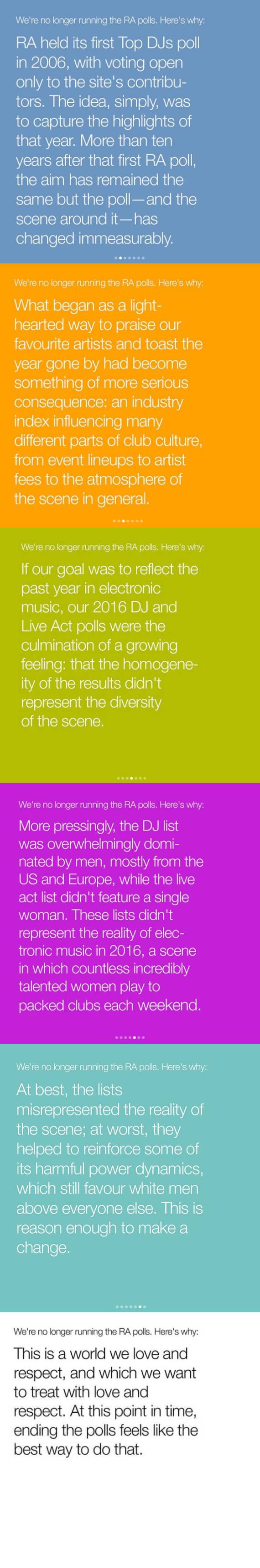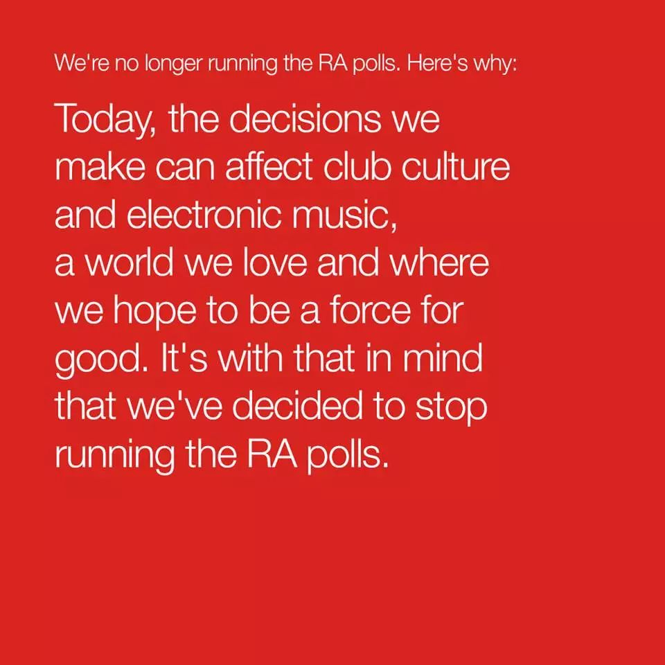 就在昨天,RA的Facebook正式公布,他们将停止名意调查。且RA官方认为,这一项决定会影响Club文化和电子音乐。虽然在这张红底白字的图片里没有明确说明为什么停下榜单和评选,但无疑大部分人认为这是好事。