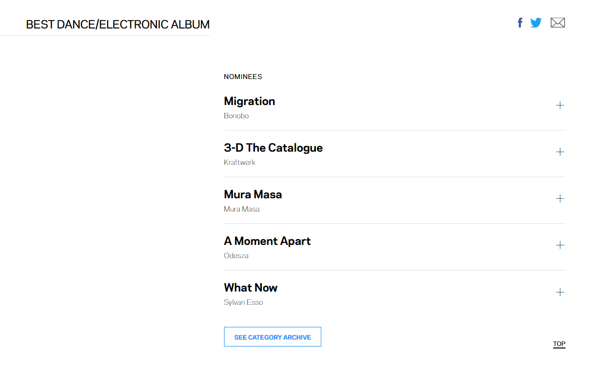 在看完完整的提名结果之后,我们率先注意到了非常重要的一点。今年的最佳舞曲唱片,和最佳舞曲/电音专辑,与以往几年大相径庭。被选中的并不是EDM超级热单,而是极具实力的更加冷门且更加纯粹的电子音乐。这样的提名结果还是挺让人吃惊的。