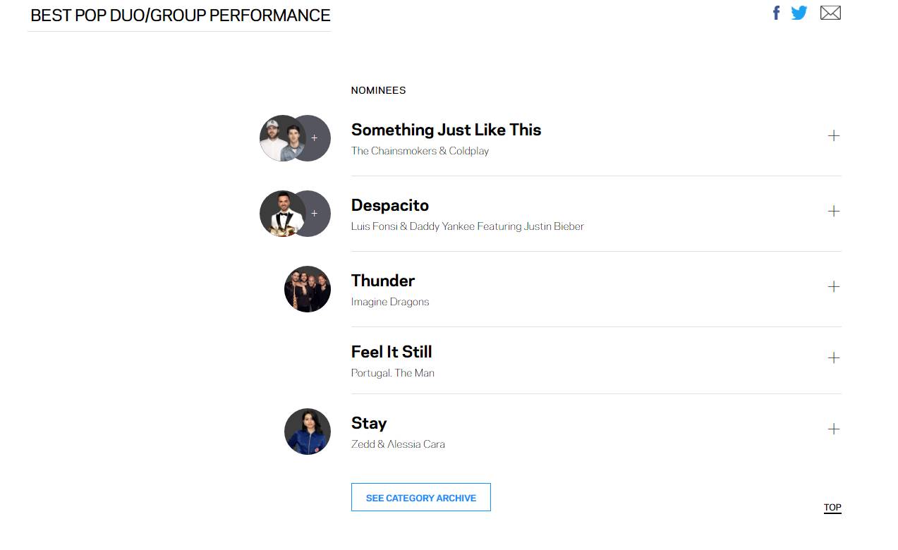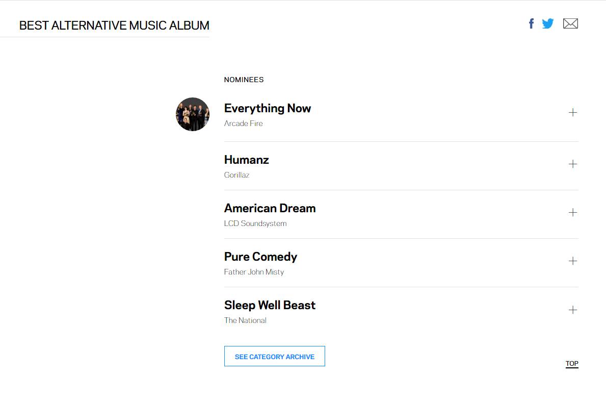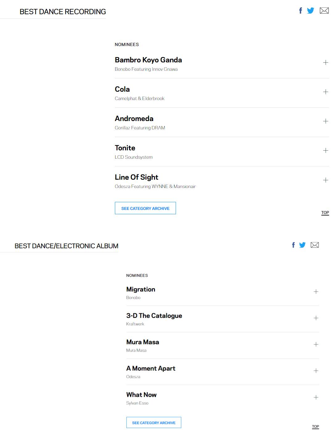 由于格莱美评选一直以多个奖项而闻名,不光只涉猎一种音乐风格,或者不光只在流行音乐圈瞩目。跟随我们的步伐先来看看最新的整体情况。然后我们会对电子音乐话题下的奖项进一步解剖。注意,图片数量较多。